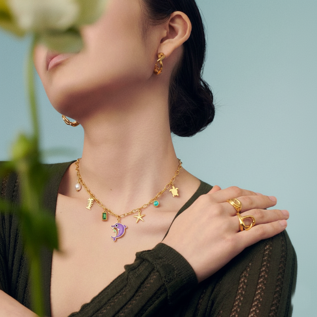 نسيم هادي ولمعة دهب رايقة حوالين رقبتِك… سلسلة رقيقة بتتدلّى عليها تذكارات صغيرة من البحر: دولفين بنفسجي فرِح في المنتصف، نجمة بحر بتلمع كأمنية قريبة، سلحفاة صغيرة تمشي على مهل، قطرة لؤلؤ ناعمة، حجر تركواز بلون الموج، ومستطيل زمردي أخضر كأنه عمق البحر. كل مشية معاها تبقى خطوة رومانسية على الشاطئ.