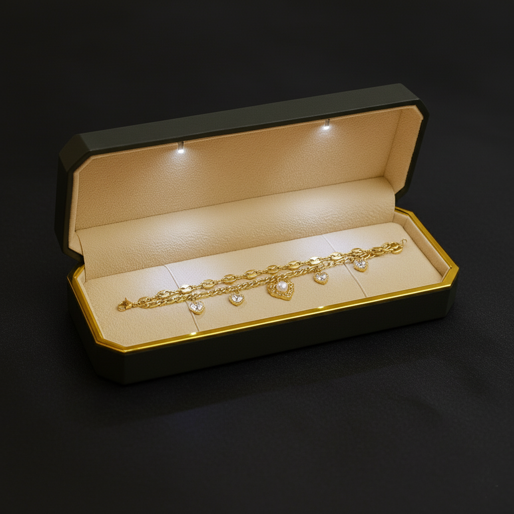 سوار دهبيّ رقيق يلفّ معصمِك بنعومة… وعلى امتداده قلوب صغيرة بتترقص مع كل حركة، وفي المنتصف قلب مزخرف يحتضن لؤلؤة دافئة—لمسة رومانسية تخطف العين وتسيب وعد حلو في القلب.