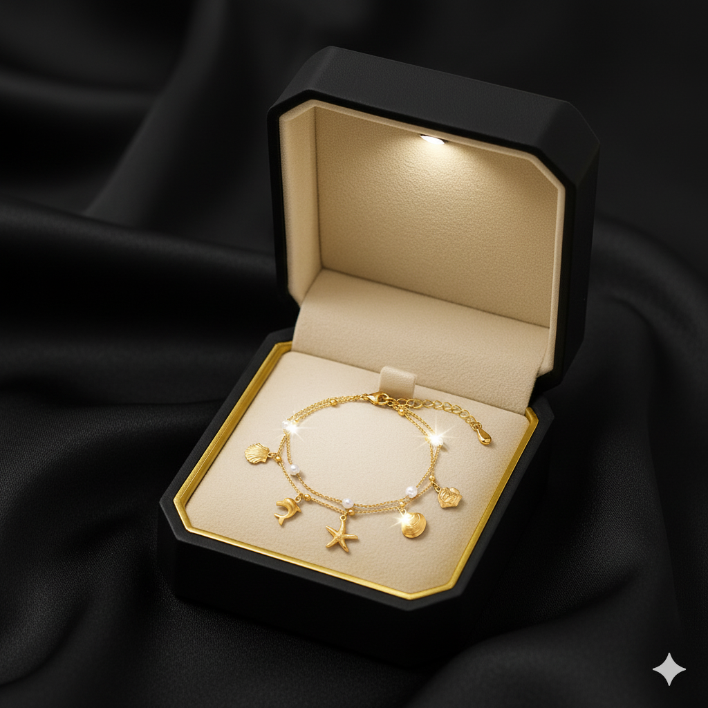 خلخال دهبي بخيوط مزدوجة ناعمة، يتراقص عليها تعليقات مستوحاة من البحر: دولفين، نجمة بحر، وأصداف صغيرة. بين كل قطعة وتانية حبات لؤلؤ بيضا بتضيف لمسة رقيقة، كأنها نقطة ضوء من موجة صافية.